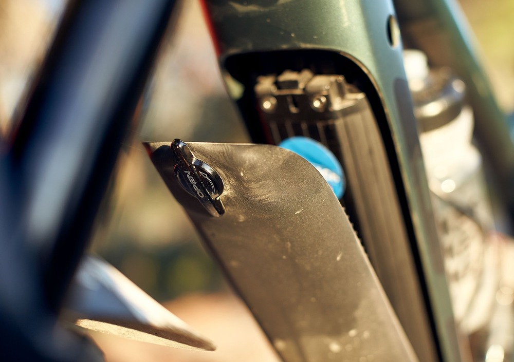 In questo caso il sistema utilizza il display della serie e7000 monocromatico che viene acceso utilizzando un pulsante sul tubo superiore, ed è la prima volta che ne vediamo un interruttore Shimano integrato: le finiture del telaio sono molto buone, e si vede anche da piccoli dettagli come questo.