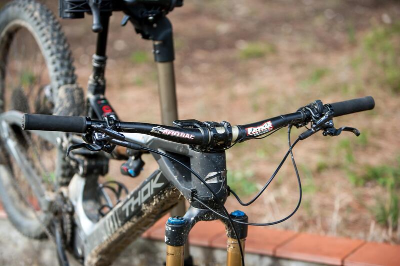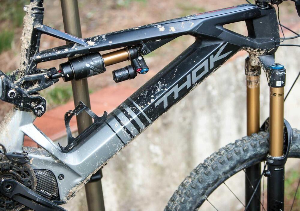 Il livello di componentistica è di alta qualità e riflette un buon design di prodotto, il cambio della THOK GRAM RC è SRAM elettrico e wireless, i freni sono Shimano XT, le ruote sono Crank Brothers e il resto dei componenti è di Renthal. L’interruttore di accensione è ben nascosto sotto il tubo orizzontale, tra i supporti dell’ammortizzatore. Sia per la batteria da 630 Wh sia per la porta di ricarica, sono stati utilizzati pezzi dalla gamma standard di Shimano. La batteria può essere rimossa con una chiave esagonale da 6 mm; infine, i cavi e i fili sono posizionati all’interno del telaio.