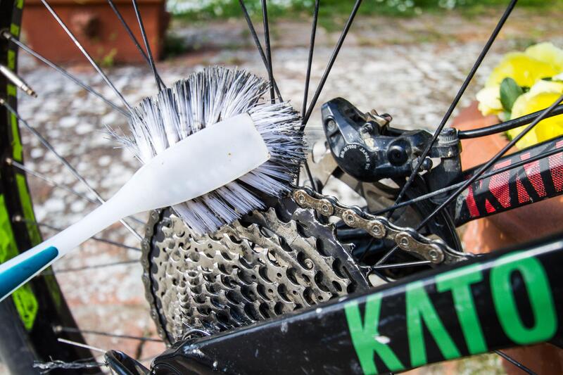 Abbiamo già rimosso la ruota posteriore, è il momento giusto per pulire anche la catena, e soprattutto la cassetta dei pignoni: con la spazzola più rigida pulire con energia per rimuovere accuratamente sporco e olio residuo. Se si dispone di un apposito attrezzo per pulizia della catena, è possibile utilizzare anche quello. Ci sono anche speciali prodotti chimici per la pulizia delle catene, ma con una goccia di sapone, acqua e duro lavoro il risultato è decisamente migliore.