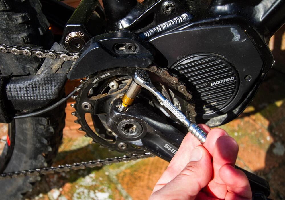 Nelle eBike la catena non gira quando si ruotano i pedali all'indietro. Per aggirare questo problema, basta inserire una chiave nel perno catena: la pedivella gli spingerà contro, e quando si gira all'indietro, fa girare la catena.