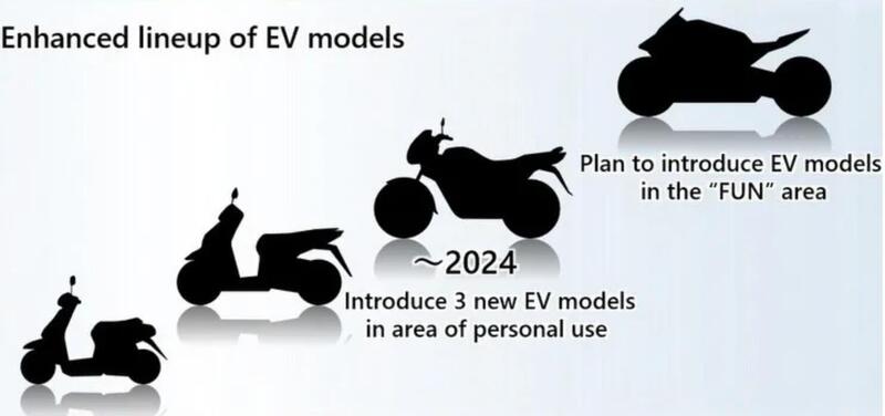 Entro il 2030 invece Honda spera che le auto elettriche arrivino a raggiungere il 40% delle vendite globali, nel 2035 l'80% e la totalità entro il 2040. Non ci sono obiettivi così chiari anche per moto e scooter, ma sta investendo molto sulla tecnologia delle batterie intercambiabili e in vista ci sono tre nuovi veicoli tra ciclomotori paragonabili ai 50cc e 125cc. A giudicare dalle immagini che hanno accompagnato la presentazione probabilmente saranno uno scooter "50", uno "125" e una moto "125". Per ora nessuna anticipazione riguardo al numero di moto che Honda chiama "fun" e con prestazioni decisamente superiori.