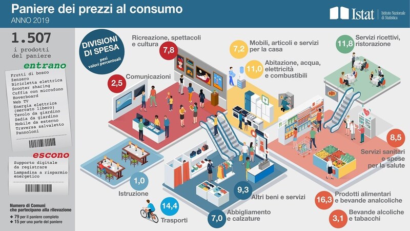 Escono dal paniere Istat, invece, DVD e CD vergini e la lampadina a risparmio energetico, sostituita dalla lampada a led già presente nella rilevazione. La diminuzione più ampia riguarda la divisione di spesa per il settore dei trasporti (-0,2594 punti percentuali), che include come voci più rilevanti i prezzi di automobili, motocicli, ricambi, manutenzione e riparazioni, carburanti e lubrificanti, e i prezzi per le varie forme di trasporto collettivo: ma non quello delle assicurazioni, che rientrano nella categoria "Altri beni e servizi".