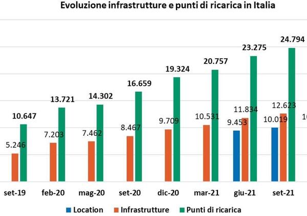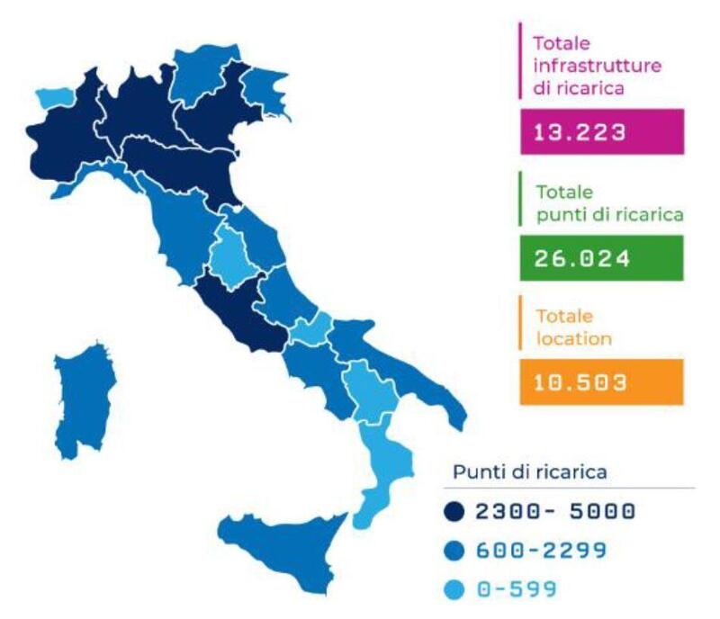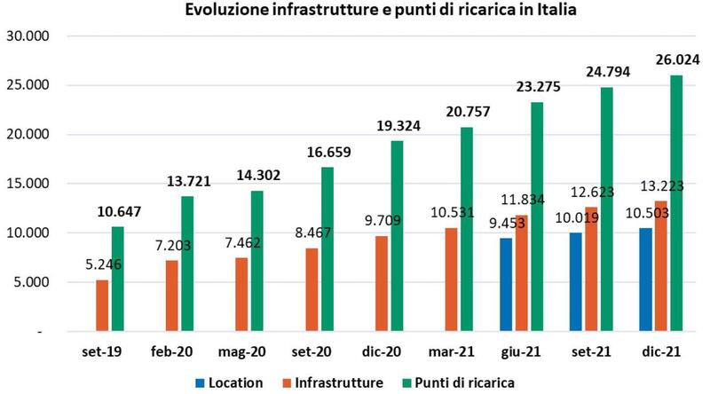 Nel 2021 i punti di ricarica sono aumentati del +35%, corrispondente a +6.700 unità. Al 31 dicembre risultavano installati 26.024 punti di ricarica e 13.233 fra stazioni o colonnine in 10.503 luoghi accessibili al pubblico.