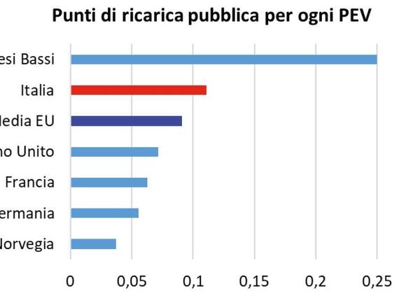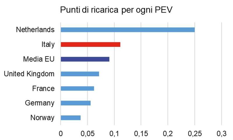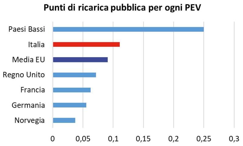 Ma se si guarda al rapporto tra numero di infrastrutture di ricarica e numero di PEV2, si nota che l’Italia è sopra la media europea ed è seconda soltanto ai Paesi Bassi.