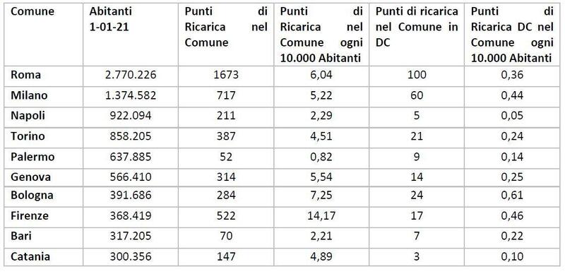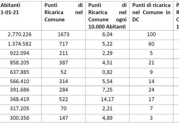 In termini relativi le regioni più virtuose del 2021 sono state il Friuli-Venezia Giulia (cresciuto del +69%), il Lazio (+53%) e le Marche (+51%). Le infrastrutture di ricarica sono maggiormente presenti nel centro-nord Italia e presso le città metropolitane: le prime 10 città italiane per numero di abitanti ospitano il 17% dei punti di ricarica nazionali, pur ospitando solo il 14% della popolazione, a conferma che la mobilità elettrica si sta diffondendo in modo importante in ambito densamente urbano.