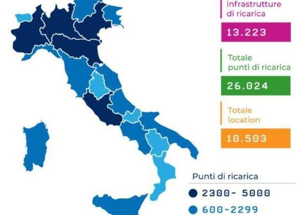 Il numero di colonnine è di fatto in linea con quello delle vendite dei veicoli elettrici - sia completamente elettrici, sia ibridi plug-in - nelle diverse aree del Paese.