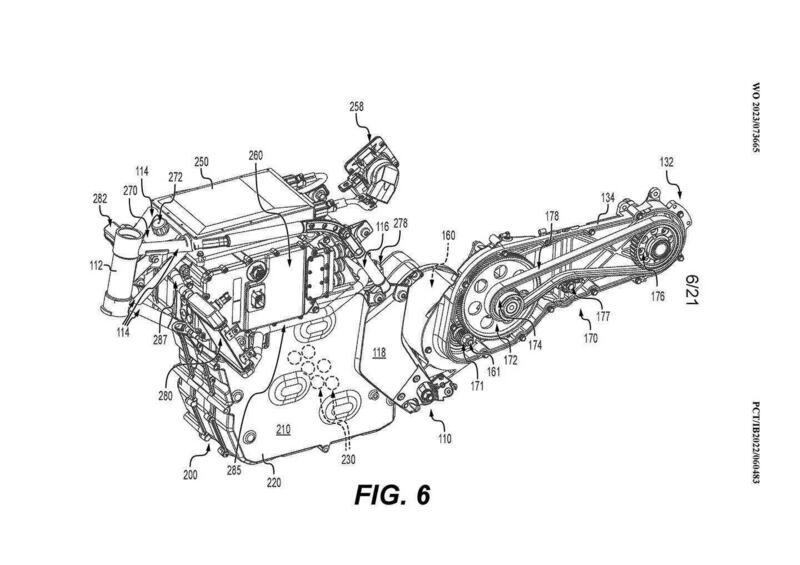 Le immagini di un brevetto, però, ci offrono qualche spunto in più. Mostrano innanzitutto che la struttura della batteria è parte integrante del telaio inoltre sembra sia composta da sette moduli con settanta celle ciascuno per un totale di quattrocentonovanta celle in rete. Inoltre l'accumulatore è raffreddto a liquido, cosa questa molto interessante: si notano due dissipatori di calore sull'alloggiamento della batteria. Le celle menzionate nel brevetto da BRP sono le LG M50L. Queste sono nel formato "21700" (21 mm di diametro, 70 mm di lunghezza), come quelle utilizzate nelle vecchie Tesla e nella MotoE di Ducati, e hanno una capacità nominale di 17,8 Wh. In base a questo possiamo ipotizzare che la capacità di questa batteria di Can-Am arrivi ad un totale di 8,8 kWh che sarebbero sufficienti - sempre per ipotesi non conoscendo le prestazioni del motore - a percorrere almeno cento chilometri. Sempre per avere dei riferimenti, il Ray 7.7 che abbiamo provato qualche mese fa ed è omologato ad 11 kW, con 7,7 kWh di batteria supera abbondantemente la soglia dei 100 km. Alla luce di queste ipotesi siamo per scartare le suggestioni proposte da alcune testate che vedendo sul titolo di alcune immagini la scritta 35KWH hanno supposto un riferimento alla capacità della batteria. Tendiamo ad escluderlo: anche se il brevetto dice che “le celle della batteria potrebbero variare in termini di capacità energetica nominale, capacità energetica utilizzabile, velocità di scarica, chimica cellulare e tipo di cella” una batteria di questa capacità avrebbe dimensioni e pesi notevolmente superiori a quelli che vediamo dalle immagini a meno di non usare una nuova tecnologia della quale non siamo al corrente. Sempre per avere un riferimento la Energica Experia ha una batteria da 22,5 kWh e visivamente ha tutt'altre dimensioni. Sempre il brevetto però rimane sibillino:
