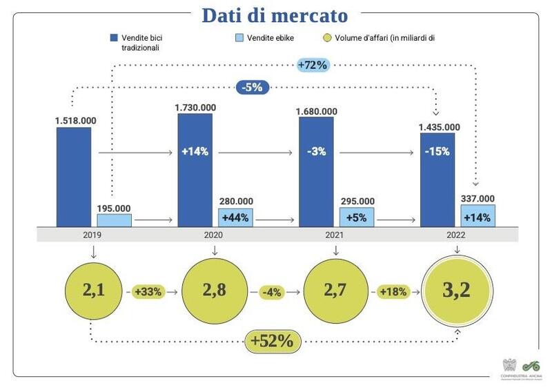 Il comparto ciclistico non è stato risparmiato dalla complessa situazione globale che ha portato a problemi di approvvigionamento, aumento dei costi, mancanza di prodotto e incertezze legate al contesto geopolitico. Confindustria ANCMA (Associazione Ciclo Motociclo Accessori) spiega così il rallentamento dell'ultimo anno, ma nell'incontro tenuto a Milano in occasione degli Emoving Days, ha ritratto un quadro dell'Italia della bici tutt'altro che negativo. Il volume d''affari, come anticipato, è più che raddoppiato rispetto il 2019 e cresce del 18% rispetto al 2019 raggiungendo i 3,2 miliardi di euro con il 68% degli acquisti che avviene attraverso i negozi specializzati.