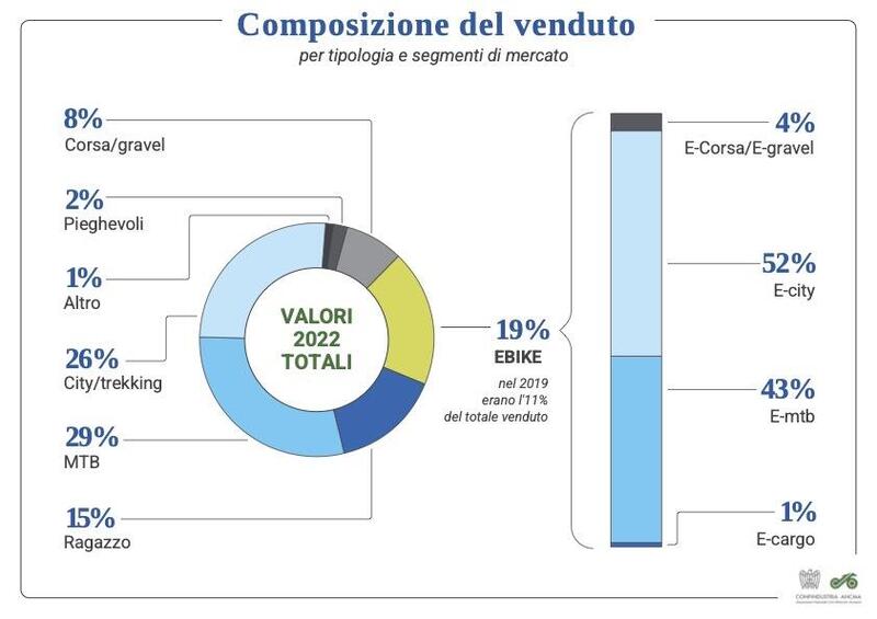 Passando invece a quelle che sono le tipologie di ebike più gettonate, le e-city si confermano in testa con il 52% delle preferenze seguite con le e-mtb al 43%. Sempre meno trascurabili le e-corsa e le e-gravel che assieme fanno il 4% e rappresentano la tendenza del momento mentre le e-cargo salgono all'1%. Ad oggi le e-bike sono il 19% del venduto in Italia.