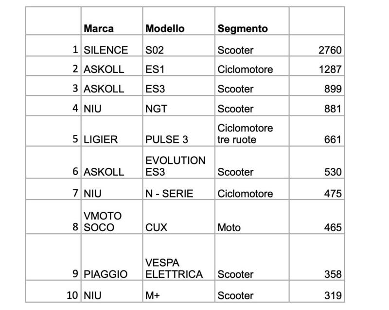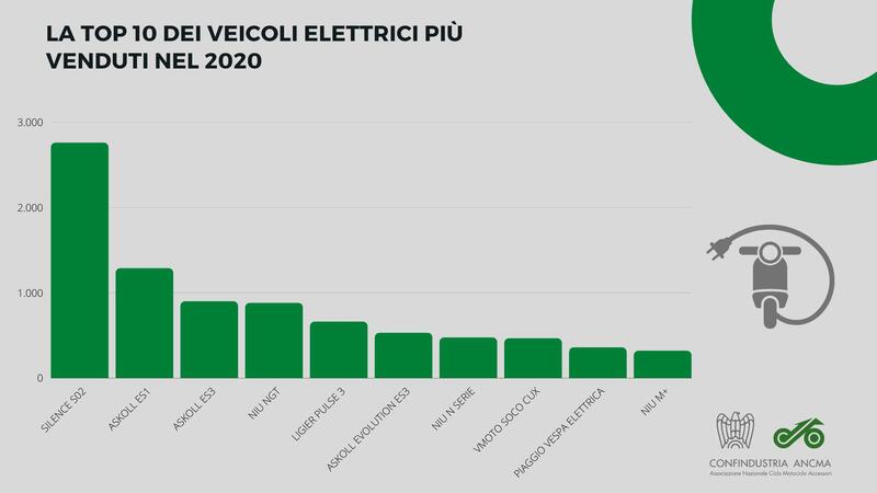 Guardando la classifica dei mezzi elettrici più immatricolati nel 2020 spicca come in testa ci siano i veicoli che oltre alla vendita ai privati sono destinati anche al business. In particolare mezzi adatti alle consegne o allo sharing. Silence conduce la classifica con 2.760 S02 immatricolati. In seconda e terza posizione gli scooter di Askoll che ha immatricolato 1.287 ES1 e 899 ES3. Per l'azienda vicentina il 2020 è stato un anno di parziale transizione: se da un lato ha ceduto sul fronte sharing e delivery, sempre più privati hanno scelto gli scooter italiani come mezzo di trasporto individuale. Anche NIU è ovviamente presente in classifica con tre modelli nella top 10: NGT, N-Serie e M+.