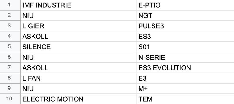 Secondo i dati forniti da ANCA Il veicolo elettrico più venduto a gennaio 2021 è E-PTIO della francese IMF Industrie, a conferma di quanto le flotte aziendali abbiano la capacità di sbilanciare i numeri del mercato. Al secondo posto il NIU NGT, seguito dal LIGIER Pulse3, anche questo uno scooter francese pensato per li delivery, usato anche da Poste Italiane. Seguono i diversi modelli di Askoll e NIU oltre che al Silence S01 e al Lifan E3.