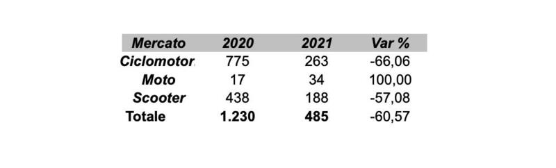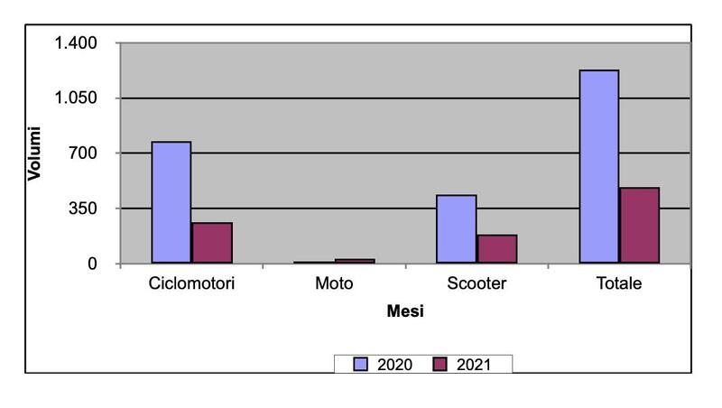 Il 2021 del mercato moto è iniziato con una brusca frenata, le immatricolazioni di moto, scooter e ciclomotori hanno complessivamente fatto segnare un – 18,2% sullo stesso mese dell'anno scorso. Molto peggio ha fatto il mercato delle due ruote a zero emissioni che rispetto allo stesso mese del 2020 registra un calo di oltre il 60%.