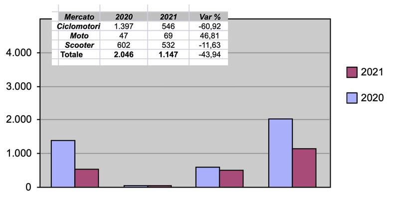 Il mercato di moto e scooter elettrici anche in febbraio continua a registrare una pesante flessione. Il bimestre si chiude con un 43,94% in meno rispetto allo scorso anno. Pesano sul bilancio le forniture di flotte aziendali per sharing e il delivery. Trattandosi di ordini per centinaia di veicoli determinano grosse fluttuazioni in un mercato in cui i numeri non sono ancora molto grandi. Non a caso il segmento più in crisi è quello dei ciclomotori che segna un -60,92% con 546 unità vendute. Meglio gli scooter che con 532 mezzi cedono solo l'11,63%. Le moto elettriche invece chiudono con un bilancio molto in positivo (46,81%) targando 69 veicoli. Un contributo non sufficiente a risollevare la media.