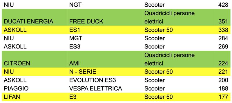 In testa alla classifica delle due ruote elettriche c'è il NIU NGT con 614 scooter venduti nei primi sei mesi del 2021. Al secondo posto la Citroen AMI che, come come quadriciclo, registra 477 immatricolazioni. Ultimo gradino del podio ancora NIU con 382 N-SERIE venduti. Bene la Vespa elettrica che con 343 immatricolazioni si piazza al sesto posto.