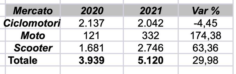 Aumentano (+174%) in proporzione le vendite soprattutto di moto elettriche: 332 contro 121 dello scorso anno (Gen-Giu), mentre sono in leggero calo i ciclomotori 2.042 contro 2.137 (-4,45%). Aumentano gli scooter da 1.681 venduti nel primo semestre 2020 a 2.746 nel 2021 (+63,36).