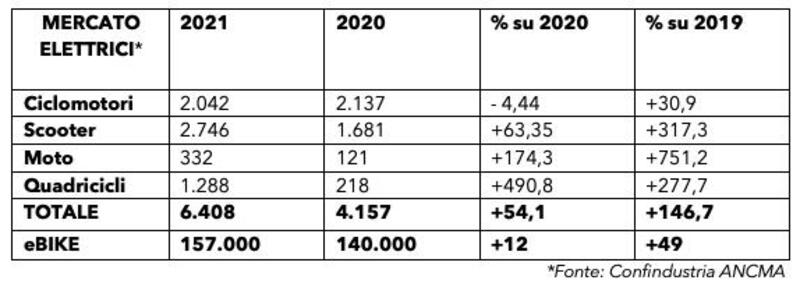 L'aumento di scooter e moto è significativo perché al contrario evidenzia come ci sia un interesse crescente da parte dei privati, e dei motociclisti in particolare, verso il mondo dell'elettrco. Secondo ANCMA lo sviluppo del settore potrà avere un ulteriore impulso anche grazie all’ecobonus per moto, scooter, ciclomotori, tricicli e quadricicli a trazione elettrica, che prevede uno stanziamento di 150 milioni di euro fino al 2026.