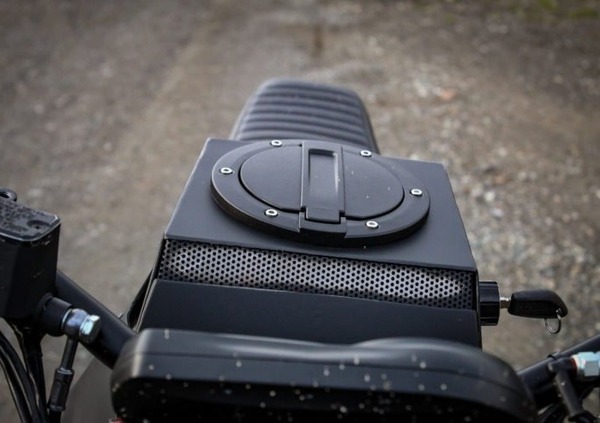 Un’altra modifica, questa volta estetica, ma anche pratica, ha riguardato il “serbatoio”, che ovviamente serbatoio non è, il quale ingloba alcune componenti elettriche e il bocchettone per il cavo della ricarica.