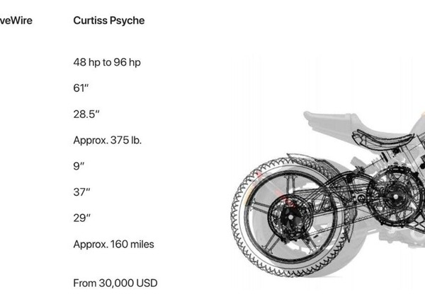 Vi sono tuttavia differenze significative nelle specifiche tra le due moto. La Livewire dispone di 105 cv, mentre la Psyche, nella sua versione più economica ne eroga solo 48, mentre la versione top di gamma arriva ai 96: ma il prezzo di questo modello è ancora sconosciuto. Per quanto riguarda la distanza percorribile con una ricarica, per la Harley dichiarano 253 km nel misto, non così lontani dai 257 della Curtiss, ma non è chiaro su quale tipo di percorsi.