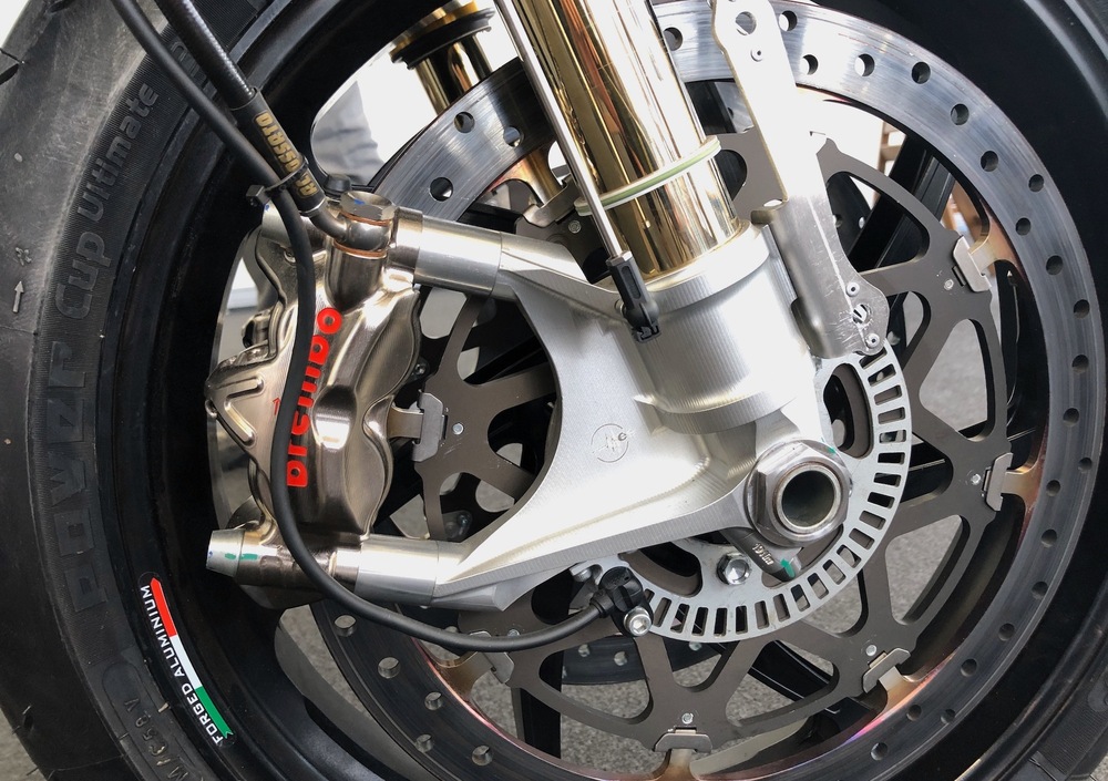 Il telaio è cambiato di conseguenza - variandone profondamente anche le misure - e adattandosi a un comparto sospensioni nettamente rivisto e alle slick Michelin. All’avantreno troviamo infatti una forcella Öhlins NIX30, al posteriore un monoammortizzatore della stessa marca, montato senza leveraggi progressivi. L’impianto frenante conta su dischi Brembo racing in specifiche MotoGP, con spessore da 6 mm e pinze GP4PR: lo stato dell’arte (almeno fino alla stagione appena conclusa…) della Casa bergamasca.