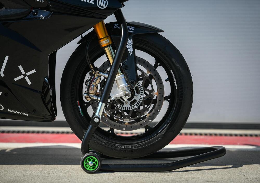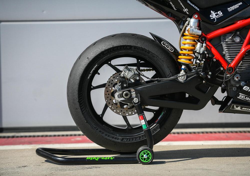 I cerchi sono Marchesini forgiati in alluminio a sette razze da 17” con canali da 3,5 e 6 rispettivamente all’avantreno e al retrotreno calzanti pneumatici Michelin Power Cup 2 - quelli più vicini alle slick utilizzate in MotoE. Diverso anche il kit trasmissione a passo 520, così come la serie sterzo realizzata dal pieno e dalle rigidità completamente diverse rispetto alla moto di serie.