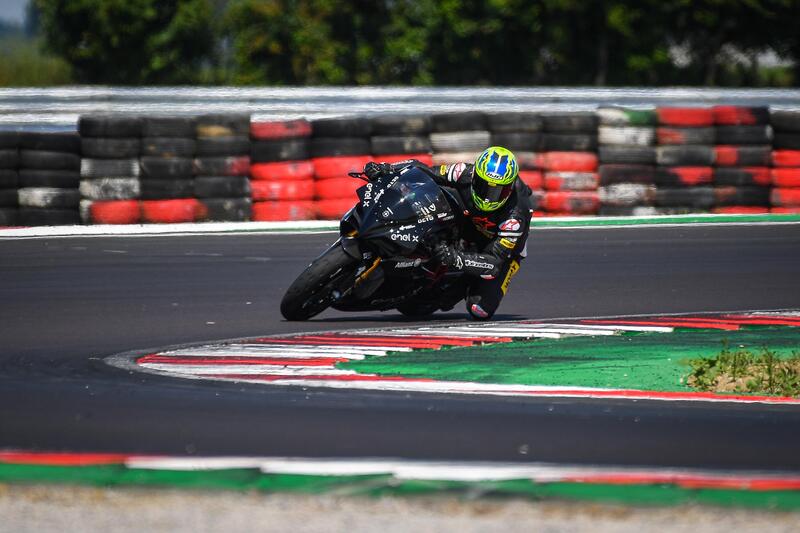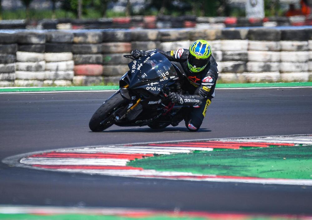 A proposito di tornate, appunto, il mio turno finisce. Rientro dopo adeguato raffreddamento e ricarica (un paio d’ore, perché fa caldo e le batterie hanno lavorato a temperatura molto elevata) con la mappa più spinta, imparando a sfruttare ancora meglio la Ego Corsa Clienti. Che più passano i giri, più mi sembra vicina a una convenzionale endotermica, magari solo un po’ pesantuccia; in compenso, in uscita di curva fila via senza soffrire del minimo complesso d’inferiorità. Infine, dopo due battute con il “Branna” - che si è fatto vedere in pista per un veloce saluto - provo a entrare con la mappa 4. E capisco davvero cosa intendesse quando diceva che così la moto va davvero forte.