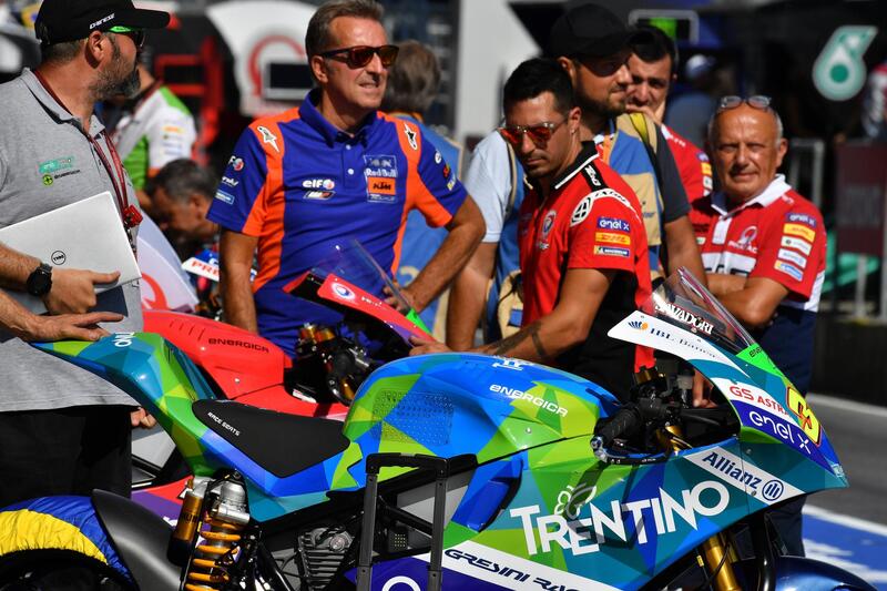 E in effetti, a Misano Adriatico, lo scorso weekend, la conferma è arrivata: purtroppo non ci è stato possibile scattare una foto delle Energica Ego Corsa in ricarica, quando le sovrastrutture vengono rimosse per avere accesso diretto al pacco batterie (il circuito di ricarica viene rimosso sulle Corsa, per alleggerirle, motivo per cui tra l'altro gli incidenti accaduti non sono imputabili alle moto ma alle colonnine, NdR) ma, avendo visto... cosa stavamo cercando, è bastato andare a spulciare gli archivi per trovare una foto in griglia (che vedete qui sotto) della MotoE del Team Gresini, guidata da Lorenzo Savadori, sulla quale, nello svaso fra carenatura e finto serbatoio, è visibile la superficie piatta del nuovo pacco batterie che abbiamo "beccato" anche sui prototipi intercettati nel Veronese.