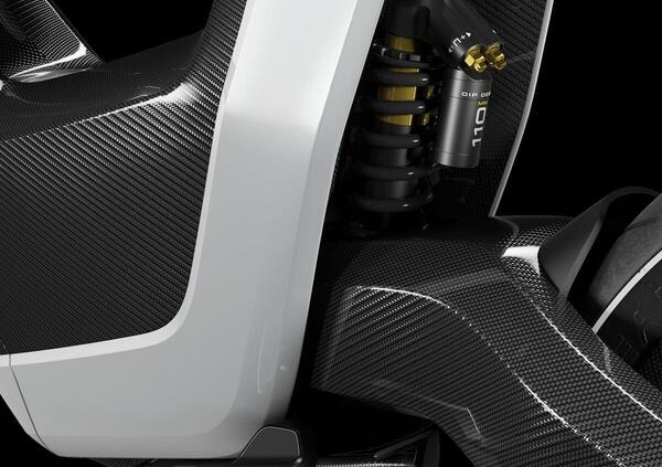 Il prezzo è esorbitante! 39.900 € IVA esclusa. Una cifra straordinaria per una moto decisamente straordinaria. Partendo dal telaio realizzato interamente in carbonio che pesa solo 7 kg con un carico utile di 125. Anche forcella e forcellone sono in carbonio e i pneumatici da 18 pollici sono montati su cerchi anche questi in fibra di carbonio.