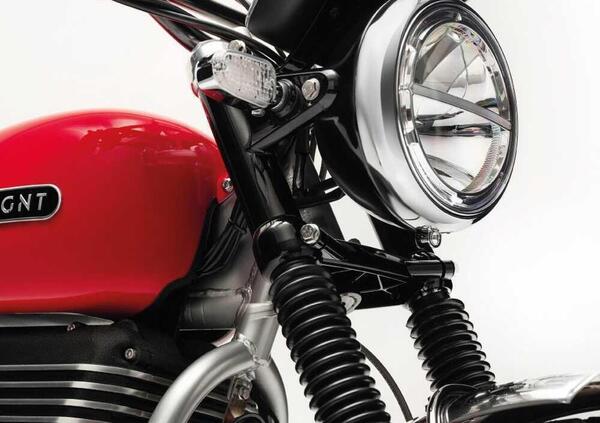 Il pacco batterie al centro del telaio a doppia culla è una citazione ai motori termici pur con volumi ben diversi. Al faro cromato e rotondo fa da contraltare un cruscotto touch LCD da 7 pollici dotato di connettività che serve a gestire le funzionalità delle trazione elettrica.