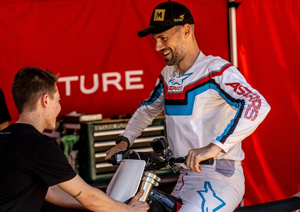 Dopo qualche giro di presa di contatto inizio a sentirmi a casa, e soprattutto a capire che il classico colpo di frizione lo puoi tranquillamente dare ruotando la manopola del gas. La prima sensazione in inserimento in curva e in volo è una certa pesantezza all’anteriore che mi hanno subito risolto con due click sullo smartphone i tecnici della Stark riducendo il freno motore. Sistemato questo e indurita un po’ la forcella con qualche click, ho iniziato a divertirmi veramente!