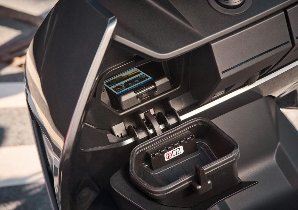 È presente sul lato sinistro un vano ventilato e impermeabile per riporre in sicurezza uno smartphone ed è disponibile una presa USB-C per la ricarica fino a 1,5 A (capacità di ricarica fino a 12 W) e, a proposito di vani, ne sono stati ricavati lateralmente e anteriormente. Il vano laterale può ospitare un caso e può essere azionato da seduti.
