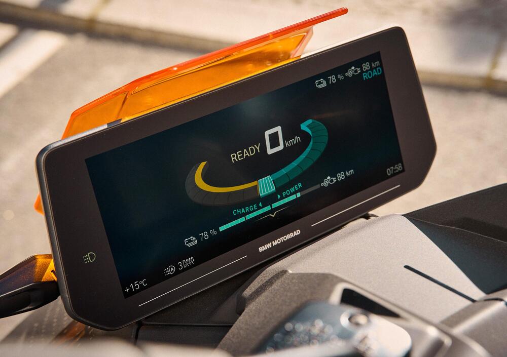La strumentazione è il centro anche della connettività del CE 04: il display a colori TFT da 10,25" Full HD supporta la navigazione a mappe integrata e con visualizzazione direttamente nel dashboard, anche attraverso l'integrazione e l'uso dell'app BMW Motorrad Connected sullo smartphone.