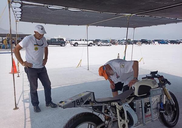 Probabilmente a questo punto della storia avete già capito tutto: la mobilità elettrica e il know-how degli ingegneri di Delfast si sono uniti alla volontà di riportare in evidenza il marchio Dnepr ed è nata così la moto che è stata poi impiegata quest'anno sul lago salato di Bonneville per battere il record di velocità nella categoria "A" Omega (Omega racchiude tutti i veicoli che partecipano alla Speed Week con una propulsione diversa da quella generata dal ciclo Otto). Il prototipo è stato condotto dal suo stesso ideatore Serhiy Malik, pilota ucraino e pluricampione delle gare alle Bonneville Salt Flats nel 2017 e nel 2018 dove ha stabilito il precedente record nella stessa categoria con la genitrice della moto protagonista di quest'ultimo record.