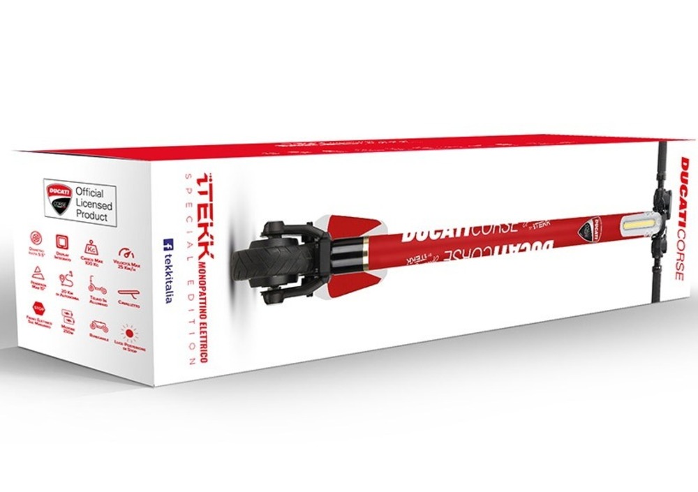 Non sapete come infilare due ruote Ducati sotto all'albero di Natale? Potete sfogare la vostra passione per il marchio di Borgo Panigale con il monopattino elettrico Itekk Ducati Corse. Un'idea simpatica per un monopatticno che fa della leggerezza uno dei suoi grandi pregi: pesa infatti solo 7,5 kg. Ha ruote piccole da 5,5 pollici e il motore da 250 W è posizionato in quella anteriore. Raggiunge una velocità di 25km/h e ha un'autonomia di 15 km. Prezzo: 220 euro su Amazon.