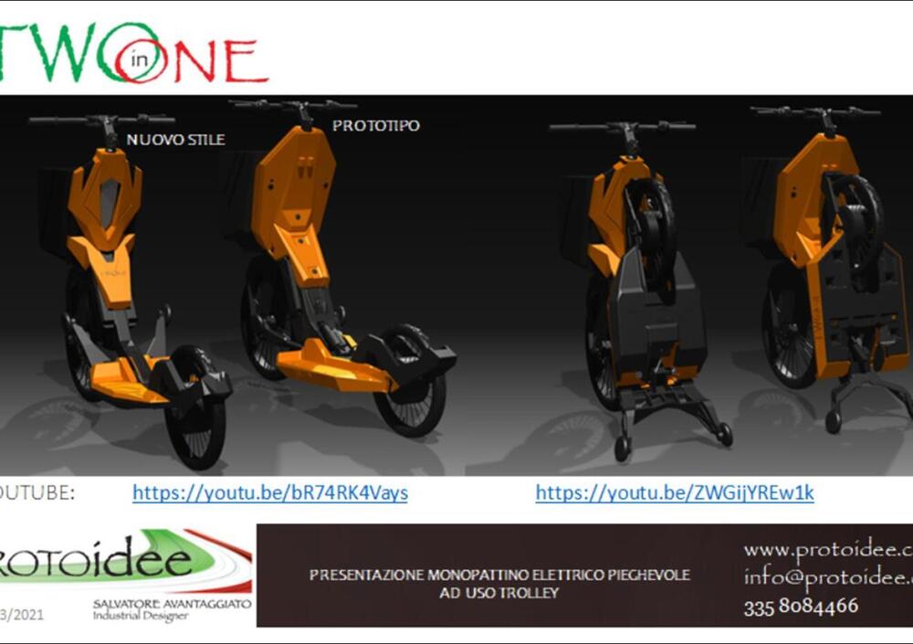 La caratteristica principale di questo monopattino però è la capacità di carico garantita dall'ampio vano anteriore e soprattutto dalla possibilità di trasformarsi che ha questo monopattino. Il nome TWOinONE infatti è dovuto alla capacità di trasformarsi da monopattino a trolley. La pedana si solleva e due piccole ruote garantiscono l'equilibrio. In questa configurazione è facilmente trasportabile anche in ambienti chiusi come treno o in ascensore, sempre mantenendo capacità di carico.