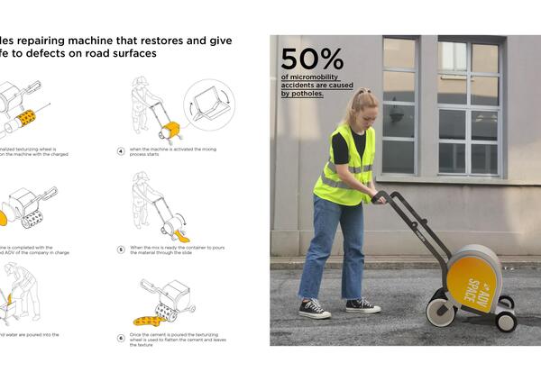 L'invenzione ha vinto le selezioni italiane del Dyson Award 2021. Un progetto per riparare le buche stradali e imprimere contemporaneamente loghi (pubblicitari) sul cemento