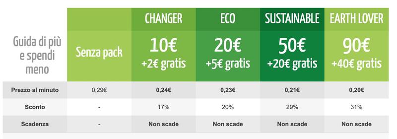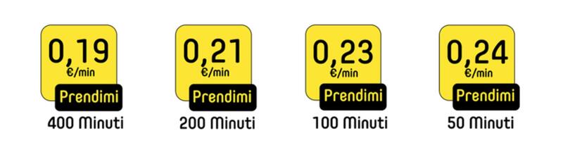 Pacchetti: 50' (0,24 €/min); 100' (0,23 €/min); 200' (0,21 €/min); 400' (0,19 €/min)