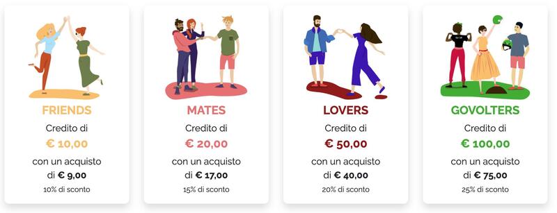 Pacchetti: 10 € + 2 gratis (0,24 €/min); 20 € + 5 gratis (0,23 €/min); 50 € + 20 gratis (0,21€/min); 90 € + 40 gratis (0,20 €/min).