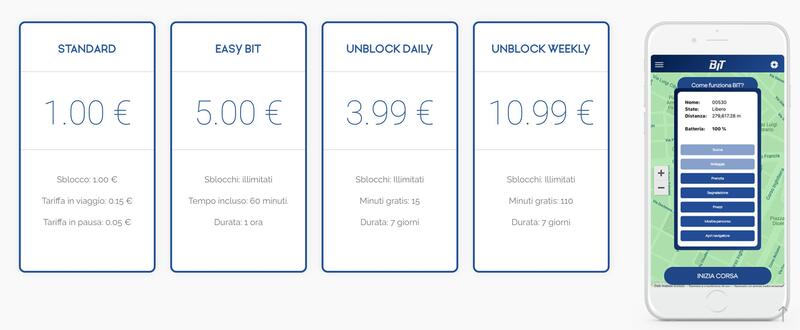 Costo min 0,15 € + 1 € allo sblocco (monopattino)