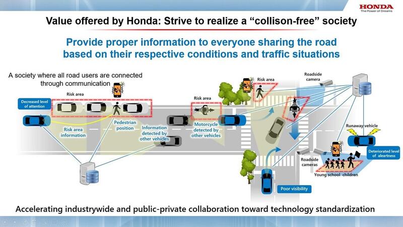 Mirando all'implementazione nel mondo reale di questa tecnologia dopo il 2030, Honda costruirà il sistema e completerà la verifica dell'efficacia nella prima metà degli anni 2020, quindi accelererà la collaborazione a livello di settore e pubblico-privato con l'obiettivo di standardizzare la tecnologia nella seconda metà del gli anni '20.