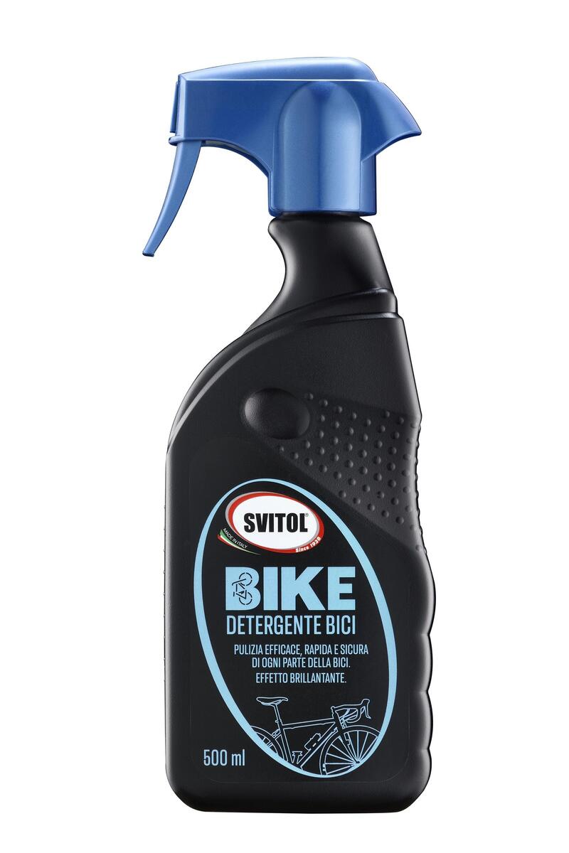 SVITOL BIKE DETERGENTE BICI: disponibile nel formato da 500ml, è pensato per la pulizia veloce e sicura su ogni parte e materiale della bici, come carbonio, alluminio, acciaio, superfici verniciate o anodizzate e gomma. La sua formulazione detergente alcalina è stata concepita per una pulizia efficace, rapida e sicura e contiene un additivo polimerico, che lega gli elementi dell'acqua dura (magnesio e calcio) e i contaminanti presenti nello smog e nella polvere (ferro, zinco e metalli pesanti). Indicato per ogni tipo di sporco, anche quello più resistente: incrostazioni, polvere, fango, smog, grasso e olio.