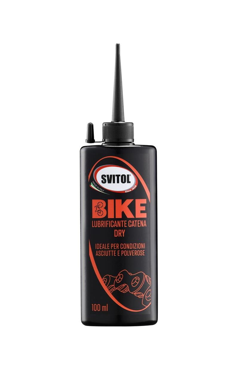 SVITOL BIKE LUBRIFICANTE CATENA DRY: disponibile nel formato da 100ml, è ideale in situazioni asciutte e polverose. La sua moderna formulazione basata su una miscela bilanciata di cere, oli sintetici e solventi, con additivazione ceramica, è pensata per garantire una lubrificazione pulita, di lunga durata e sulle lunghe distanze nelle condizioni più secche. A differenza dei lubrificanti con scaglie di PTFE, le microparticelle ceramiche hanno dimensioni molto inferiori, che permettono di aderire e penetrare nelle microrugosità della superficie metallica, e formare su di essa una barriera compatta, uniforme e particolarmente resistente contro usura, polvere, sporco e agenti ossidanti. Evaporato il solvente, si forma un film lubrificante solido non appiccicoso, pulito e resistente alle intemperie, che si liquefa solo nel punto in cui c'è lo sfregamento.
