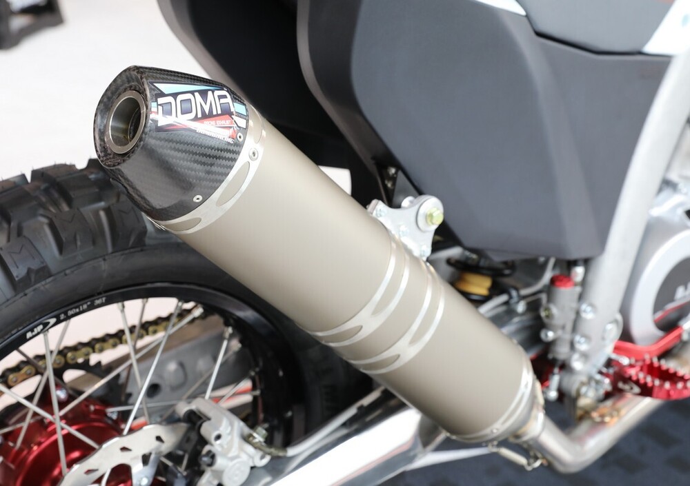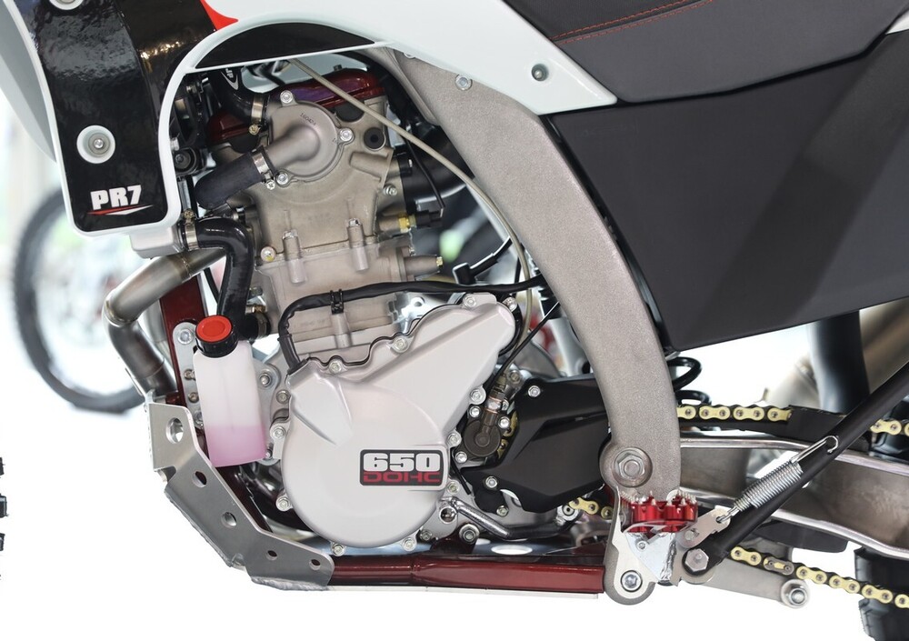 Il propulsore è abbracciato da un telaio misto acciaio/alluminio, sostenuto a sua volta da una forcella da 48 mm completamente regolabile e da un monoammortizzatore Sachs regolabile nel precarico e nell’idraulica con link marchiato AJP.
