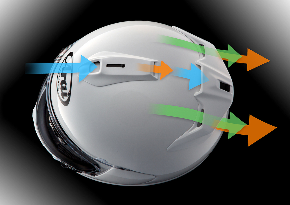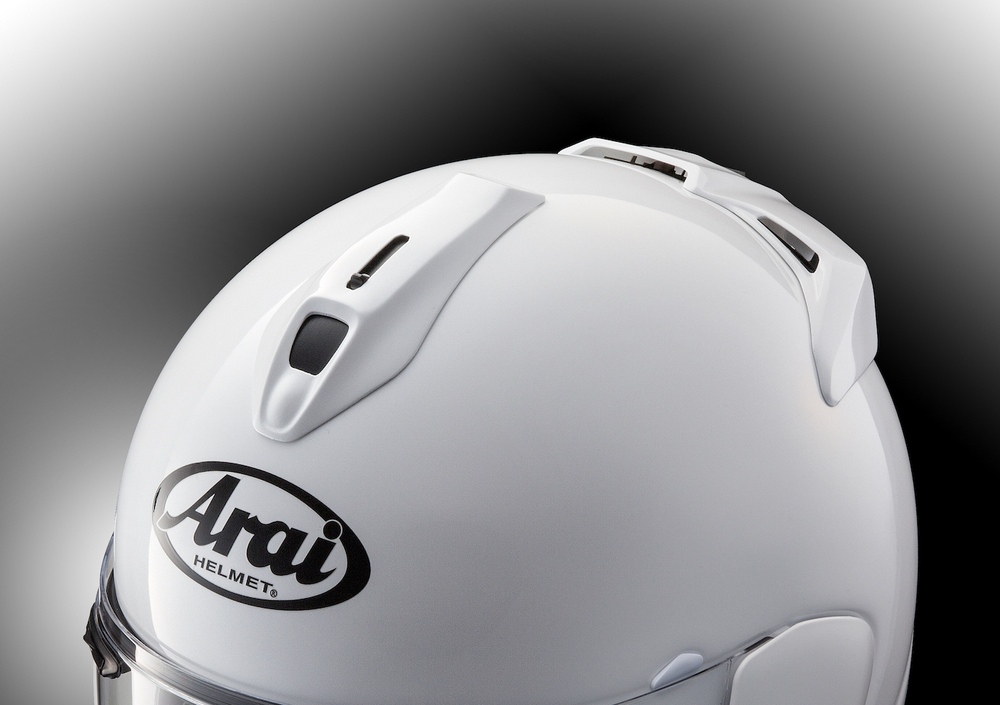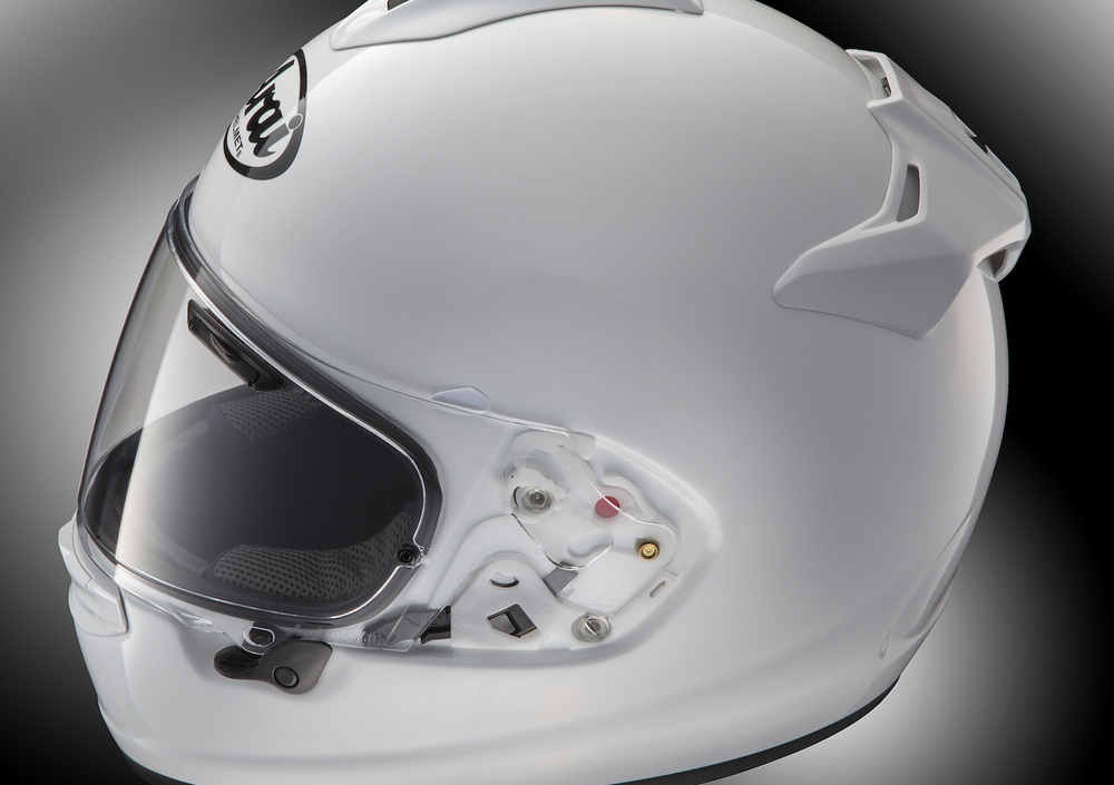 Vi abbiamo già parlato delle soluzioni tecniche di cui sopra: il meccanismo VAS rende più pratiche e veloci l’apertura e la chiusura della visiera grazie al meccanismo di aggancio di derivazione F1, oltre a semplificarne e velocizzarne il cambio, rendendo anche molto più rara l’eventualità di rotture sulle “orecchie” coprivisiera. Ma lo scopo principale dell’adozione del sistema VAS (Variable Axis System) sta nella possibilità di rendere la calotta ancora più rotonda e regolare nel suo andamento, per scaricare (ovvero to glance off, nella terminologia inglese utilizzata da Arai) l’energia cinetica che il casco è costretto ad assorbire in caso di caduta senza innescare rotazioni, torsioni o quant’altro. La sagoma R75 (ovvero lo standard interno utilizzato da Arai per indicare la curvatura) nella versione precedente del Chaser non poteva andare oltre per la limitazione imposta dalla visiera.