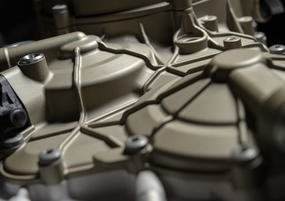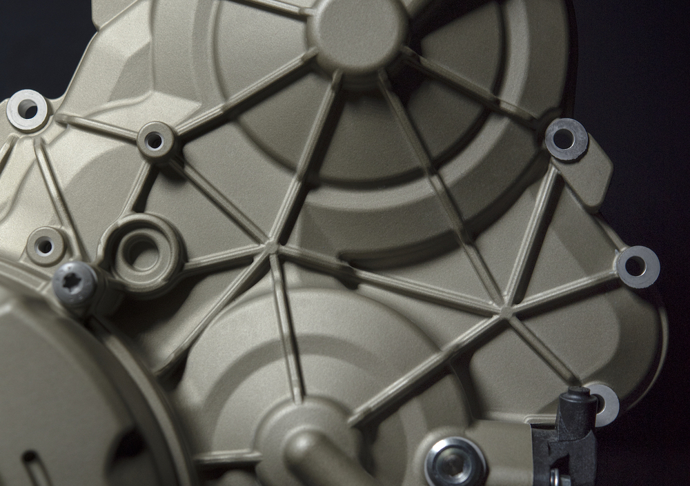 I carter motore sono realizzati in alluminio (con tutti i coperchi pressofusi in magnesio, come anche la coppa dell’olio e i coperchi teste) separati con taglio orizzontale e con il semicarter superiore che integra le canne dei cilindri in alluminio con riporto in Nikasil. I pistoni sono unità stampate in alluminio, con bielle forgiate in acciaio, e definiscono un rapporto di compressione di 14:1.