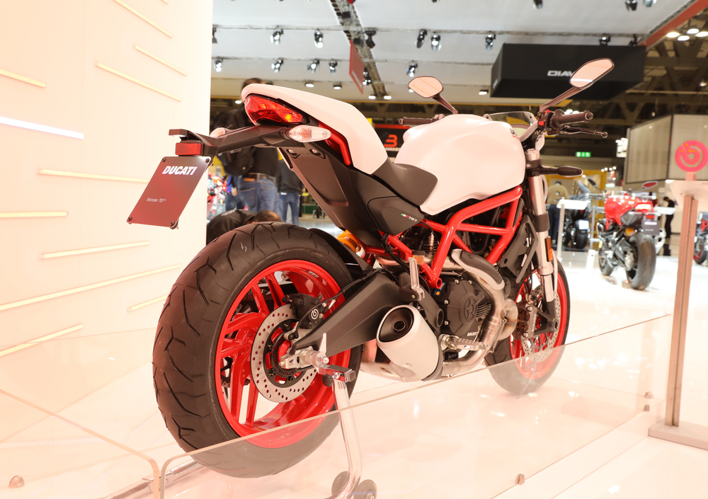 Moderno e tradizionale allo stesso tempo, il 797 ha una linea inconfondibilmente Monster, con il serbatoio muscoloso, il codino ridotto ai minimi termini e un inedito telaio a traliccio “vero”, che prende le distanze dallo schema tecnico utilizzato sulle 821 e 1200 con un forcellone bibraccio fuso in alluminio che invece, questo sì, ricorda molto l’andamento dell’unità impiegata su Multistrada 950 e Scrambler.