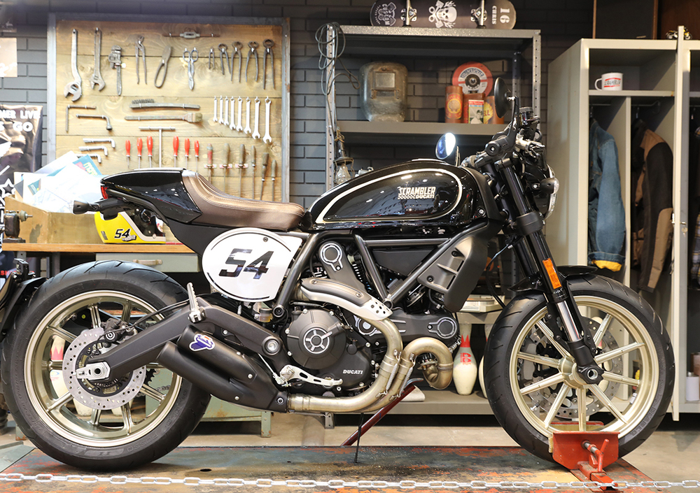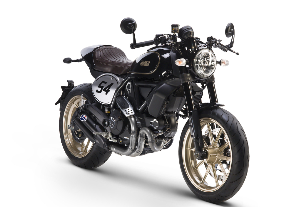 Davvero bella la Scrambler Café Racer che debutta quest’anno al Salone EICMA di Milano 2016. La base ciclistica e motoristica è naturalmente quella della Scrambler Icon, con importanti modifiche però nella posizione di guida e in alcune componenti ciclistiche – i cerchi, per esempio – per risultare più sportiva e performante, oltre a proporre il look che appunto contraddistingue le Café Racer nate negli anni 60 in quel di Londra con la citazione del numero 54 sui portanumeri, quello con cui Bruno Spaggiari corse alla Mototemporada del 1968.