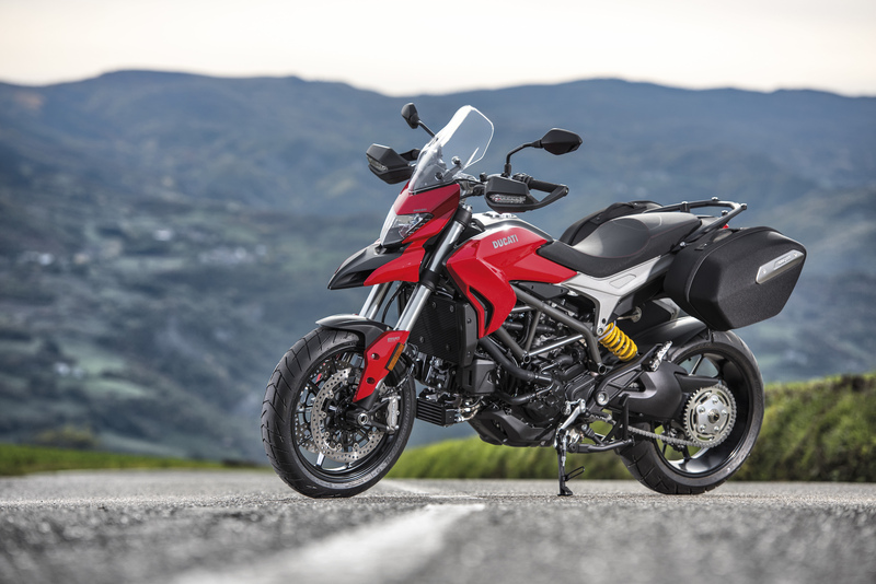 L’Hyperstrada 939 è in vendita solo in Rosso Ducati con telaio grigio. Pensata per i percorsi extraurbani, è equipaggiata con borse semi-rigide removibili da 50 litri e il cavalletto centrale. Per migliorare il comfort il manubrio è rialzato di 20 mm e il cupolino monta un parabrezza touring. Sono presenti inoltre due prese di corrente da 12 V, progettate per l’alimentazione di dispositivi di navigazione o dell'abbigliamento termico, e la sella è più ampia per incrementare il comfort ed è dotata di maniglie per il passeggero. La sella scende a 810 mm per facilitare l’appoggio a terra anche con moto carica e passeggero. Le sospensioni dell’Hyperstrada 939 sono affidate ad una forcella Kayaba a steli rovesciati da 43 mm, mentre al posteriore troviamo un mono Sachs regolabile in estensione e precarico. L’Hyperstrada 939 ha un peso di 187 kg a secco.