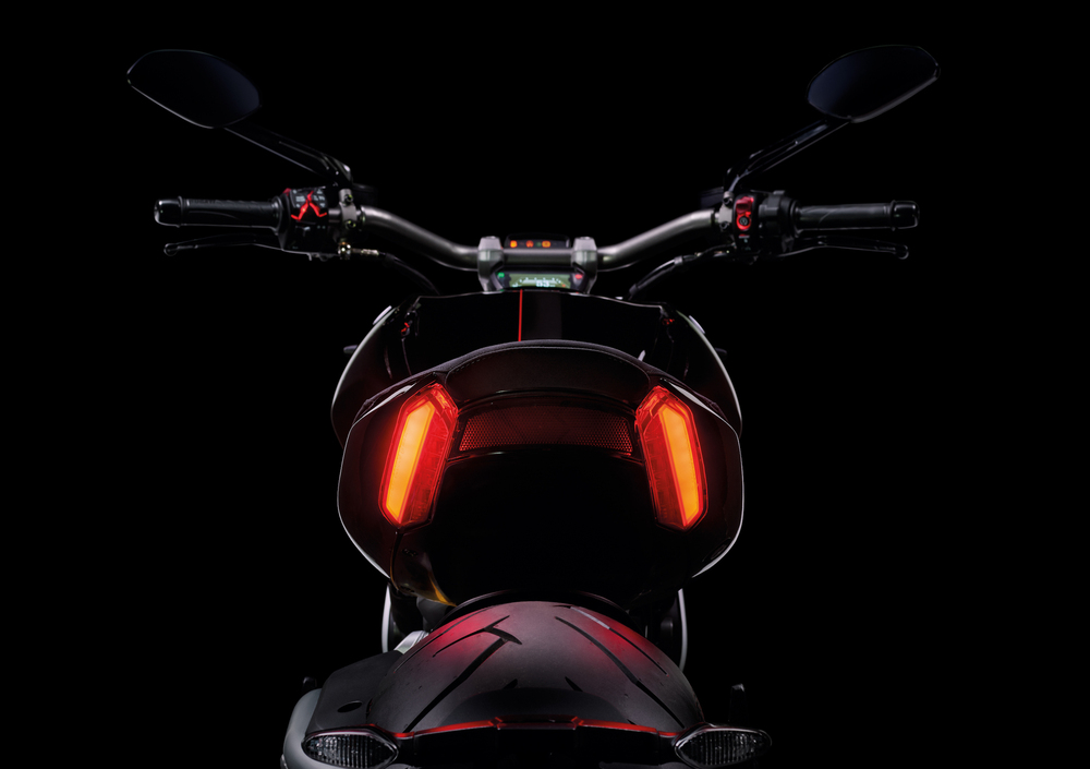 La strumentazione segue lo schema già noto, con cluster spie sul manubrio e schermo TFT separato, in zona blocchetto d’avviamento. Blocchetto che peraltro non serve più, perché XDiavel fa debuttare l’avviamento hands-free su Ducati, permettendo l’accensione del motore da remoto attraverso la chiave/telecomando. I fari, anteriore e posteriore, sono full-LED, con la versione XDiavel S dotata di luci diurne DRL.