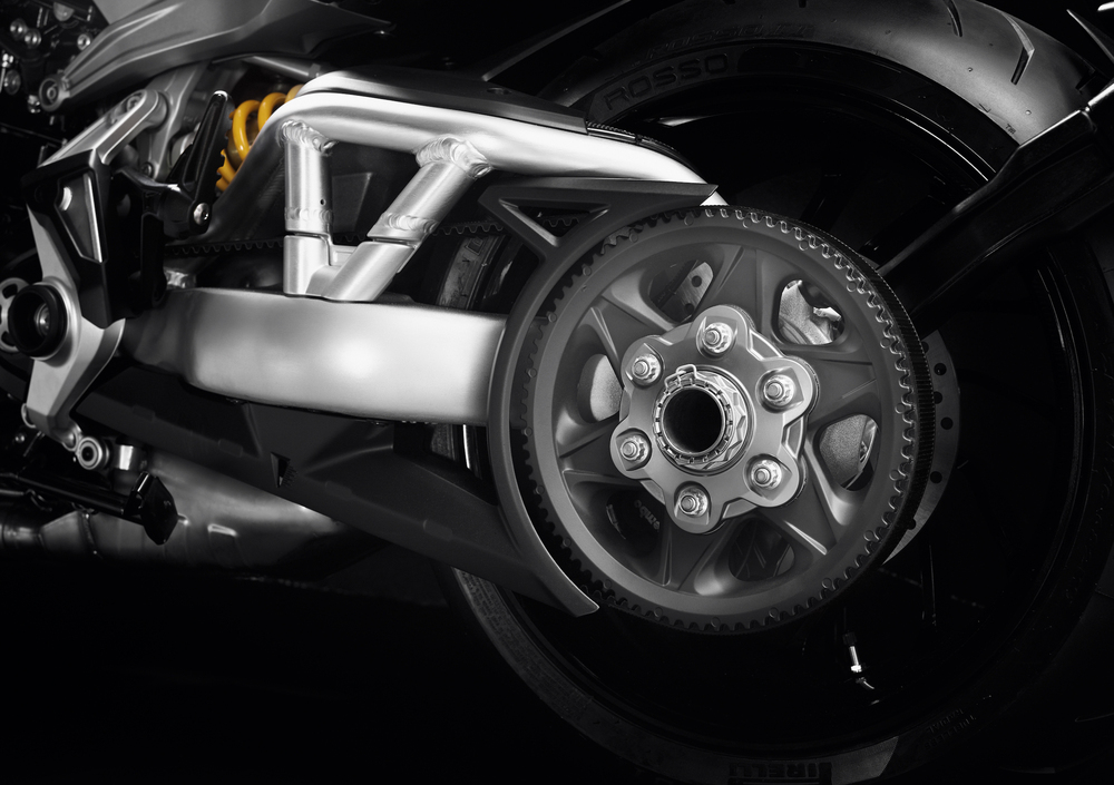 Gli pneumatici restano quelli, imponenti, di Diavel. All’avantreno troviamo un 120/70ZR17, mentre il posteriore è dominato da un 240/45ZR17, entrambi Pirelli Diablo Rosso II. L’impianto frenante conta su pinze Brembo monoblocco M4-32 con pompa radiale che lavorano dischi da 320mm e disco posteriore da 265mm. Grande novità – per Ducati – anche in zona trasmissione, con l’avvento di quella cinghia praticamente irrinunciabile nel mondo cruiser.