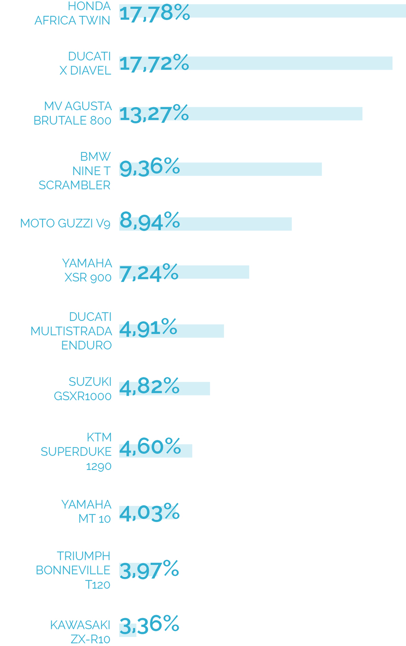 Una naked sportivissima, come la Yamaha MT-10 derivata dalla R1, ha raccolto il 4,03% delle preferenze, sopravanzando appena un'altra classica: la nuova Triumph Bonneville T120 (3,97%).